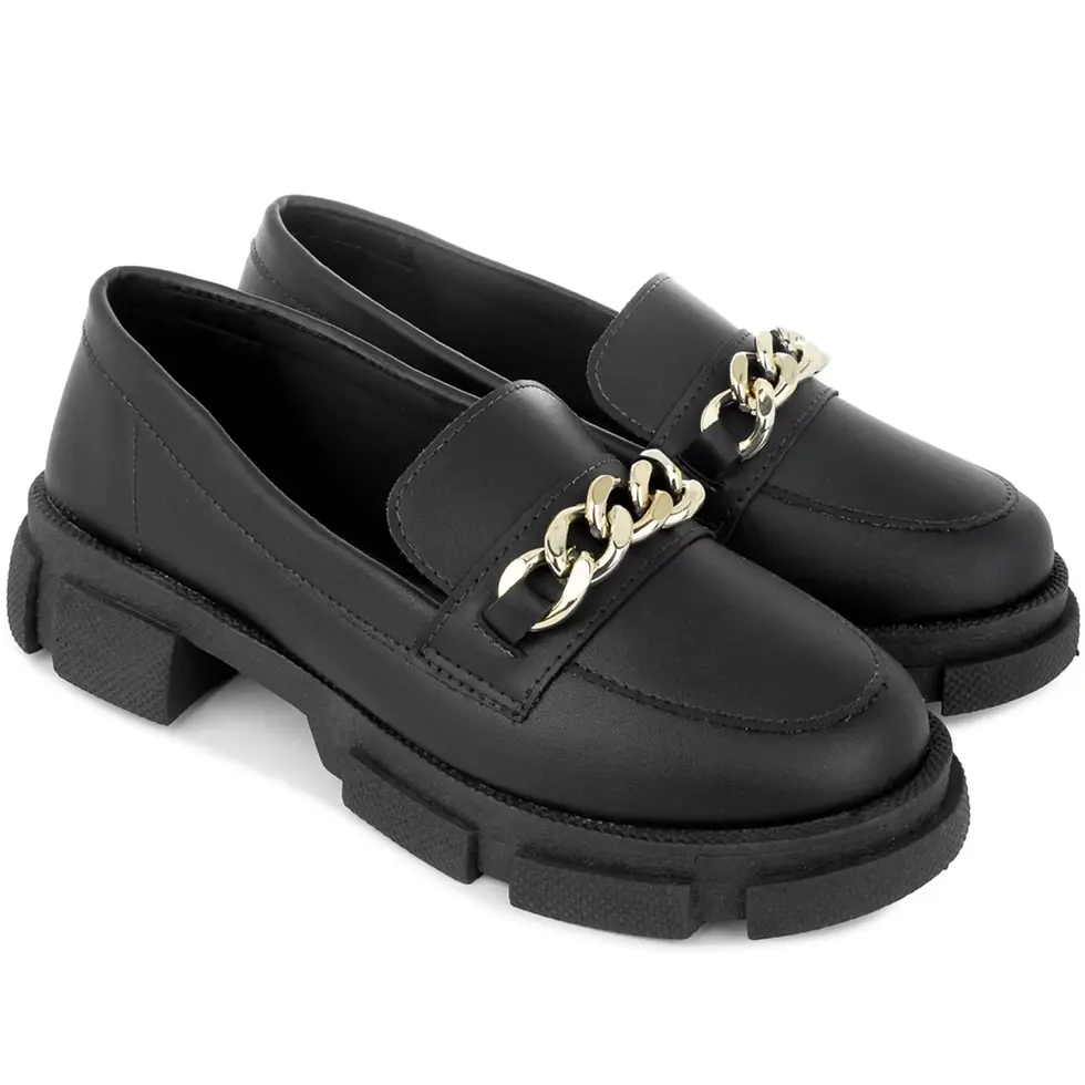 Mocassim Feminino Tratorado Confortável Oxford com Corrente Preto